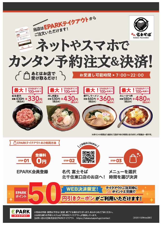 北千住東口店限定! EPARK導入! 券売機不要で店内もテイクアウトもご利用できます! 4/5ラクサそば記念丼も販売開始!