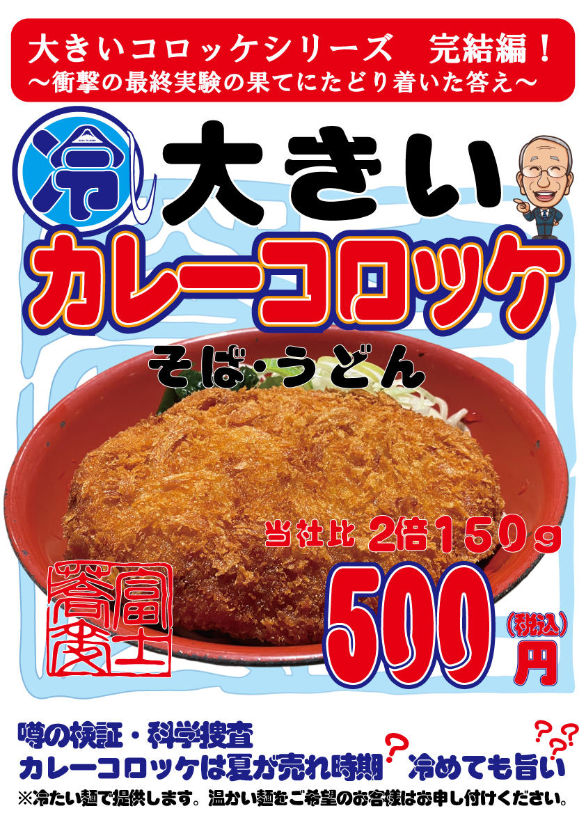 冷し大きいカレーコロッケそば500円(税込)の販売を始めました。
